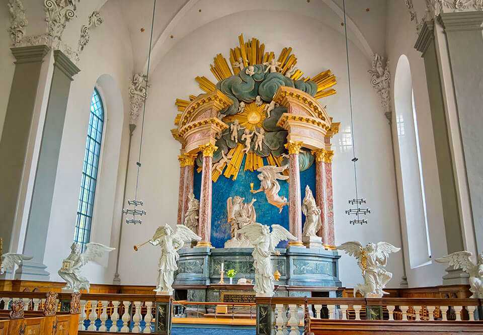 Винтовая лестница — это символ смирения и покорности человека. Интересно, что направлена она против часовой стрелки. Есть легенда, которая гласит, что эту идею не одобрил король Дании. Огорченный архитектор поднялся на самый верх и сбросился с башни. Конечно, это всего лишь предание, он умер уже после освящения церкви в 1757 году. Внутреннее оформление церкви необычайно великолепно и торжественно. Мраморный алтарь, искусно покрытый позолотой, резные колонный, большой орган, карильон, насчитывающий 48 колоколов — все это демонстрирует величие божественной силы.