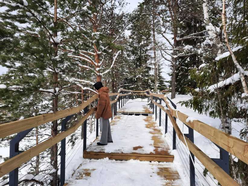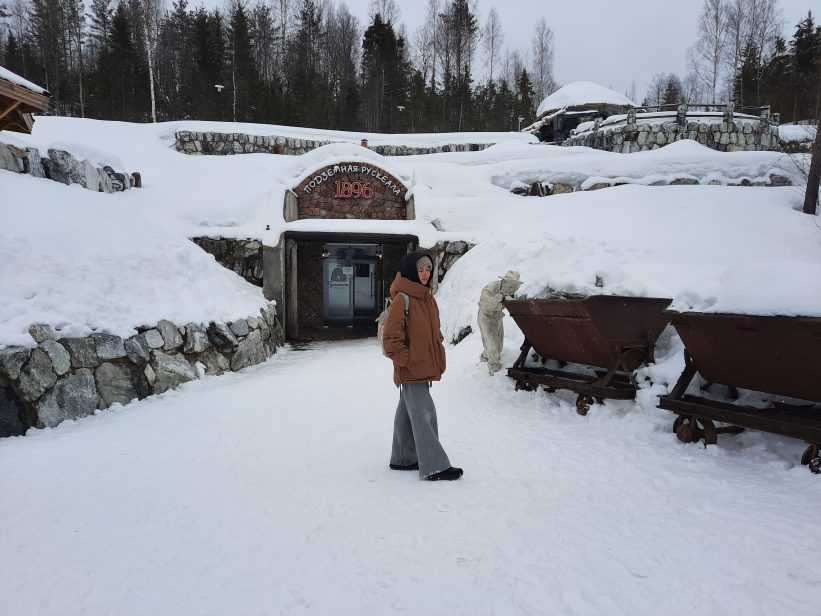 Горный парк Рускеала — это окультуренное место, есть дорожки, смотровые площадки, аттракционы. Свежий воздух, фантастическая природа и виды. Мы были зимой, когда вокруг все бело — серое. И все же есть своя красота в верхушках заснеженных елей и сугробах по колено
