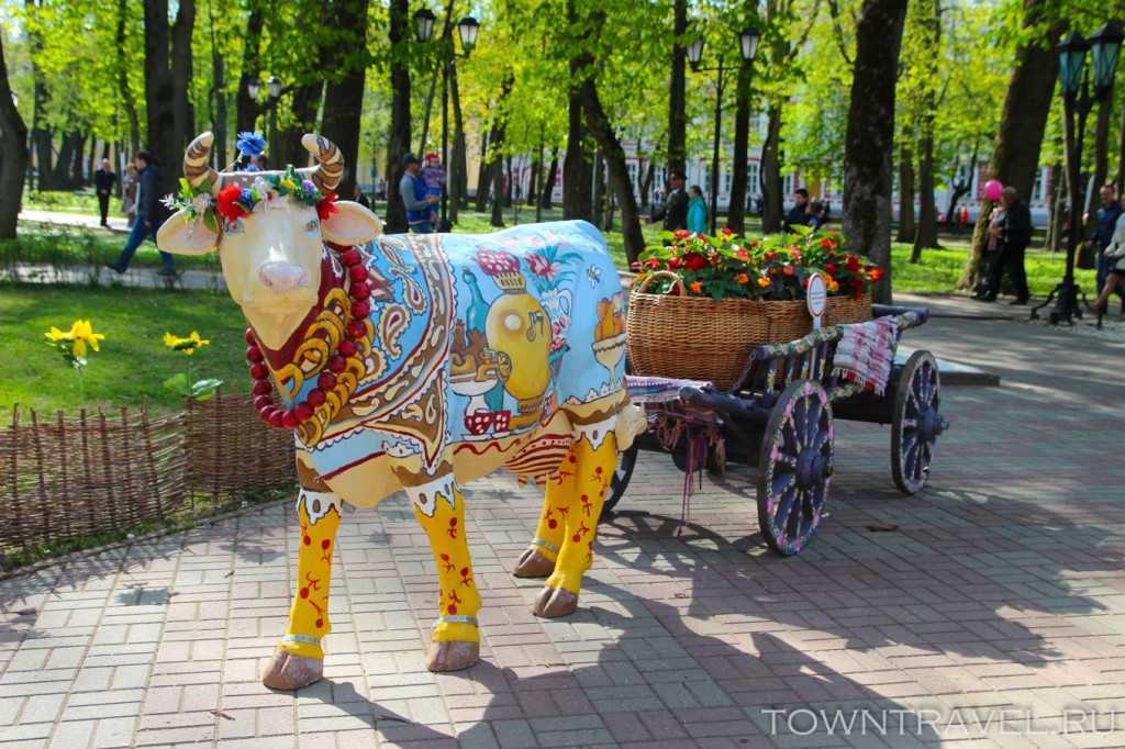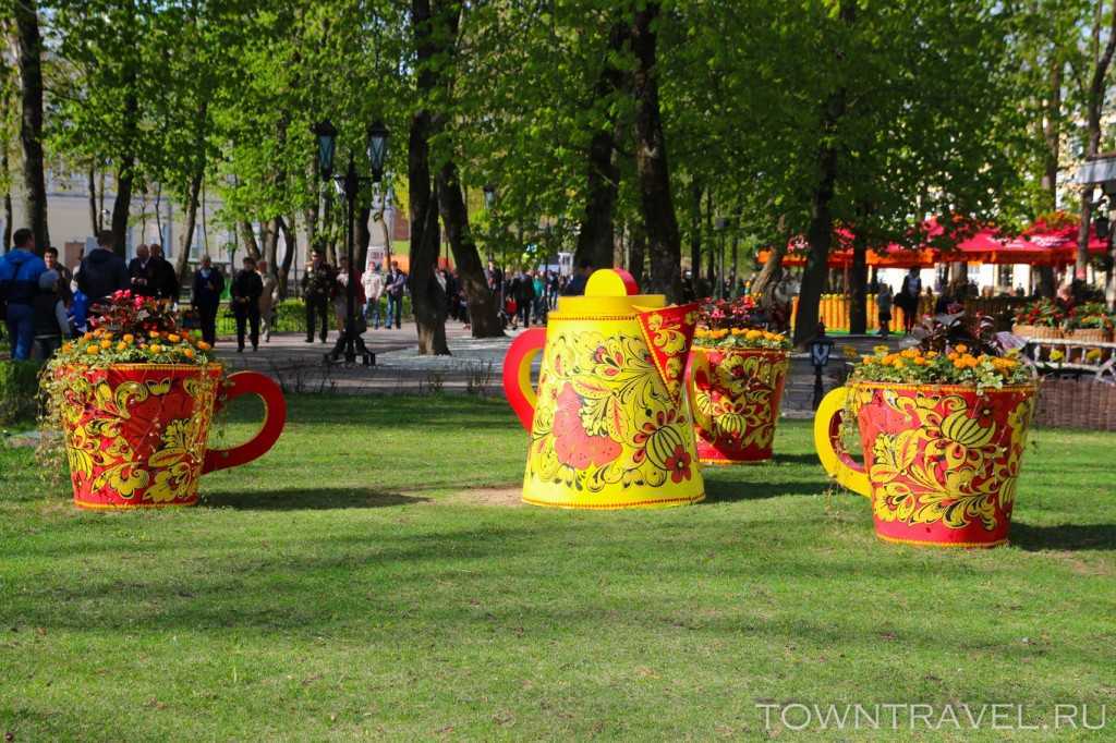 В парке находится симпатичное кафе, расписной зал которого оформлен в русском стиле. Вокруг заведения хозяева установили несколько интересных инсталляций: корова с повозкой, клумбы в виде чашек и чайничка. Правильная, а главное, интересная реклама!