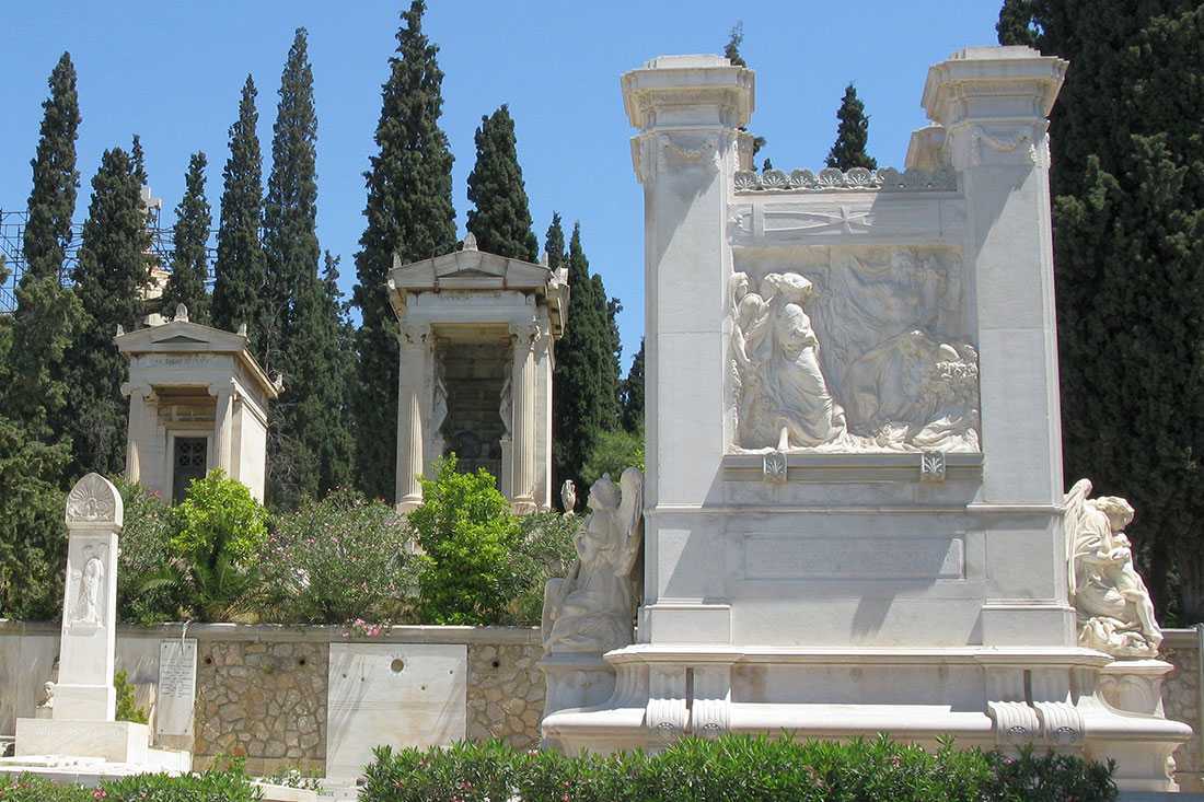 На Первом афинском кладбище похоронены многие известные люди, в том числе археолог Генрих Шлиман (1822-1890), чей мавзолей украшен сценами Троянской войны, и семья Бенаки.