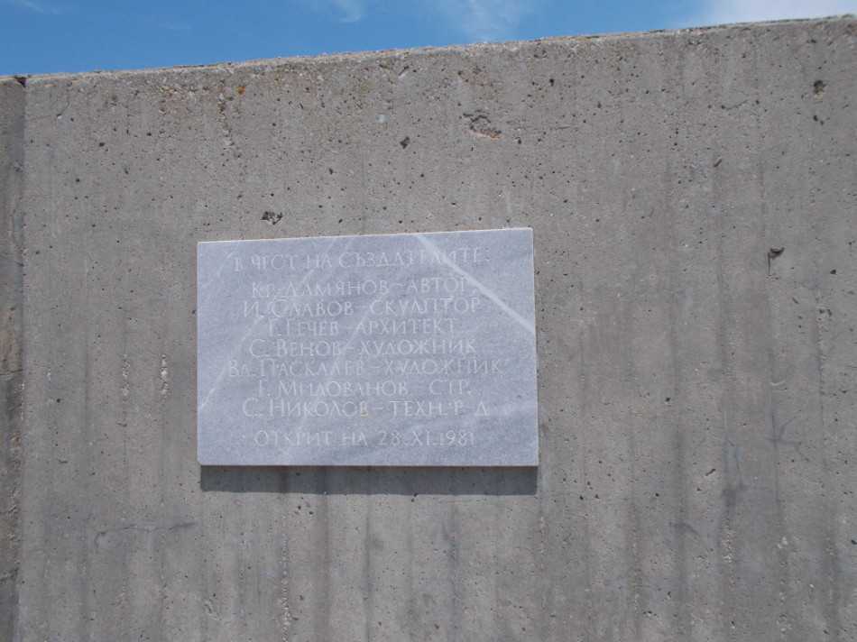Город Шумен памятник 1300 лет Болгарии — табличка говорит о том, кто и когда создал этот впечатляющий монумент