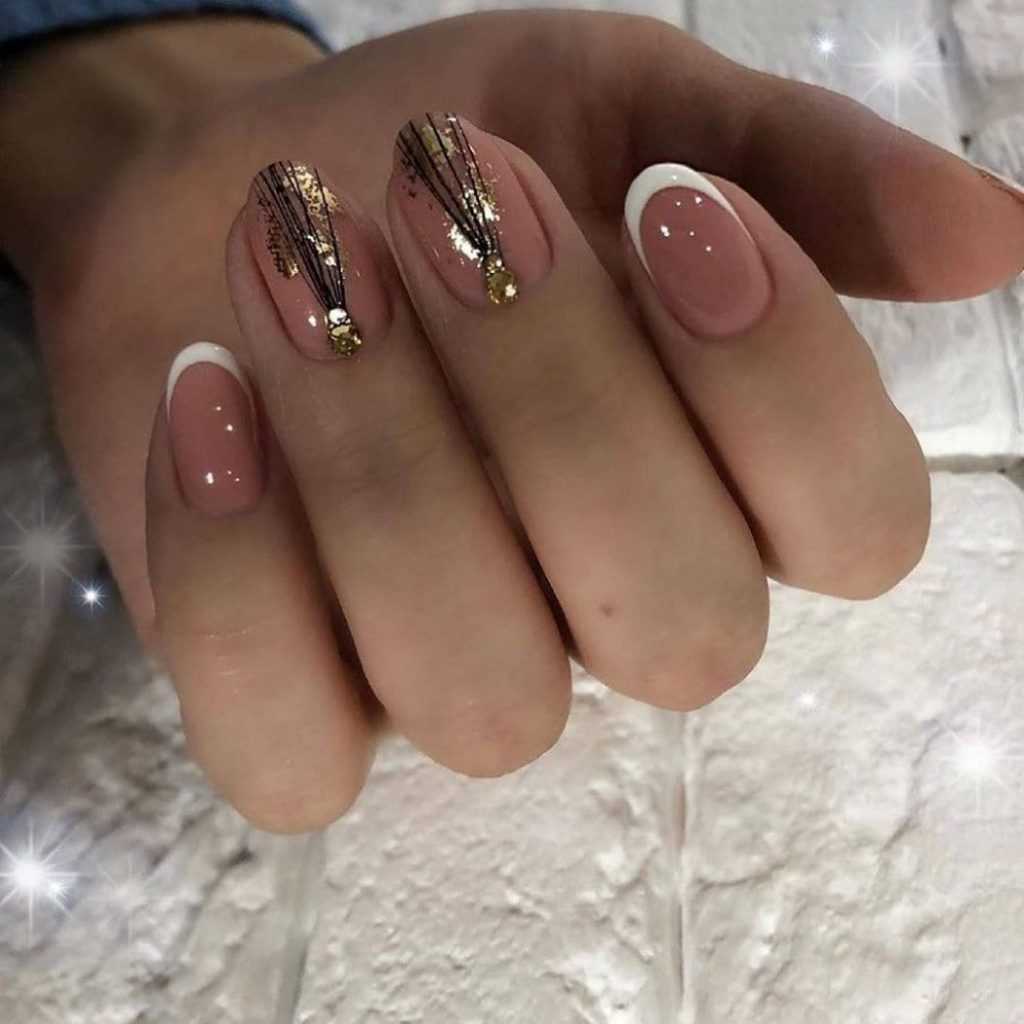 А остальные — разными цветами бежевого. Тем, кто предпочитает минимализм, понравятся варианты дизайна с вкраплениями фольги. Покрытие для ногтей можно выбрать готовое или самостоятельно расставить фрагменты фольги — аккуратные серебряные или золотые акценты.