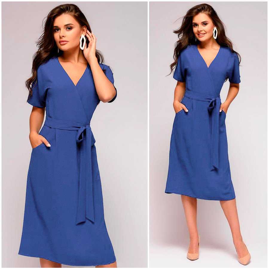 Платье с запахом завязывается на талии поясом, имеет вольный нижний крой, бывает выше и ниже колена. Оно визуально удлиняет и подчеркивает тонкую шею, а также делает акцент на стройной фигуре. Девушка в подобном наряде выглядит очень женственно и кажется еще стройнее. В качестве обуви к синему платью-халат идеально подходят туфли на шпильке.