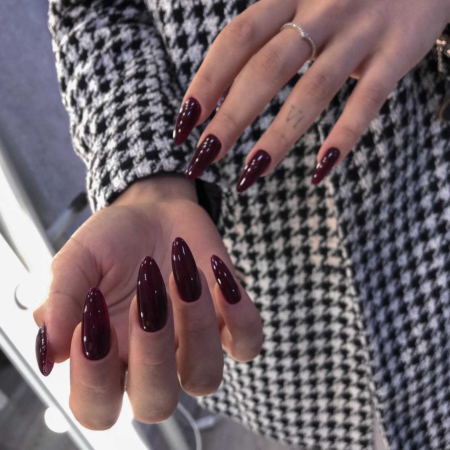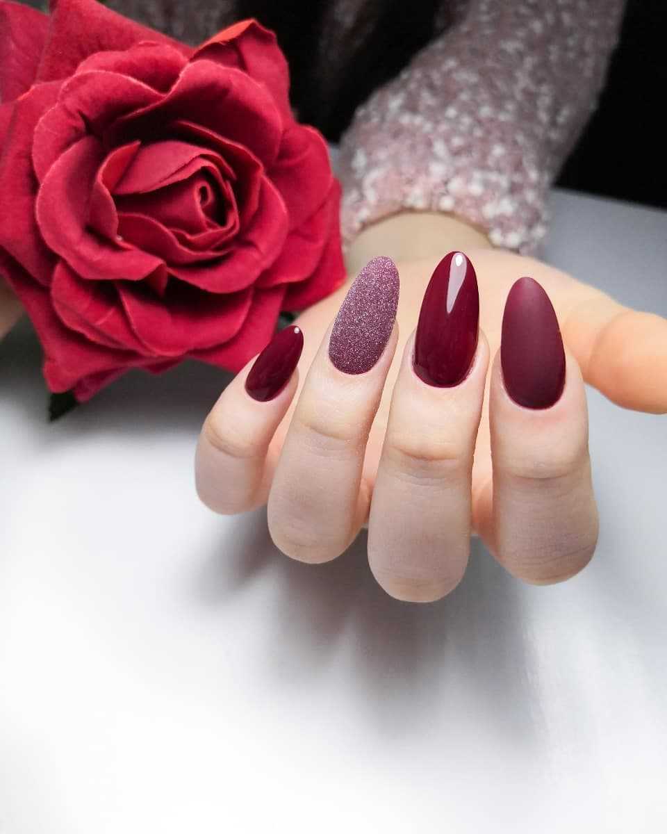 Всемирно известные мастера ногтевого сервиса повсеместно используют классическое сочетание бордо. В глянцевых журналах мы можем часто наблюдать аккуратно выполненный маникюр темно-красного цвета с такими элементами декора: бежевый или зеленый орнамент, золотая дорожка из песка или страз, металлическая лунка, омбре из подтонов. Популярность держит матовый топ, который создает бархатный эффект.