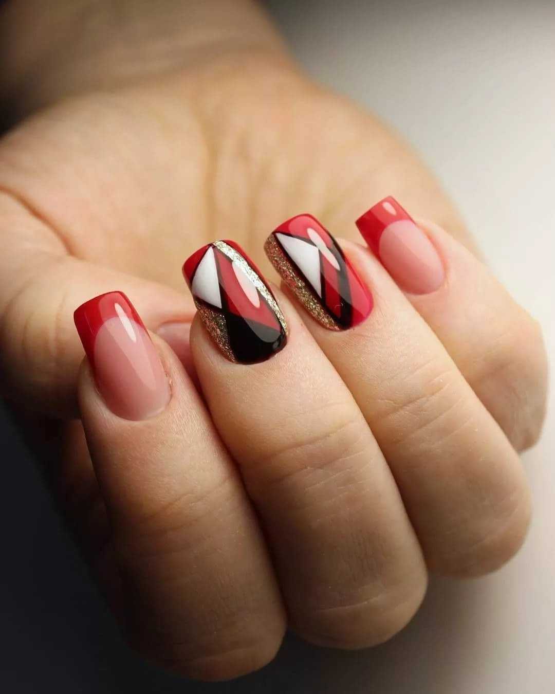 Сочетание двух строгих, выразительных цветов красного и черного на ногтях смотрится броско. Современные нейл мастера для создания неповторимого дизайна играют с палитрой, используя разные техники. Это градиент, кружево, «negative space», «color block» или строгая геометрия. Каждая из них актуальна в этом году. Для украшения подойдет битое стекло, камифубуки или фольга.