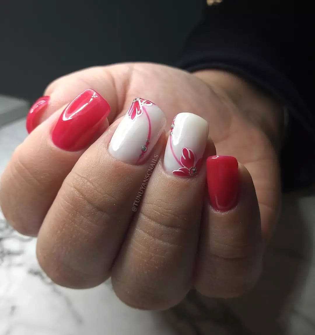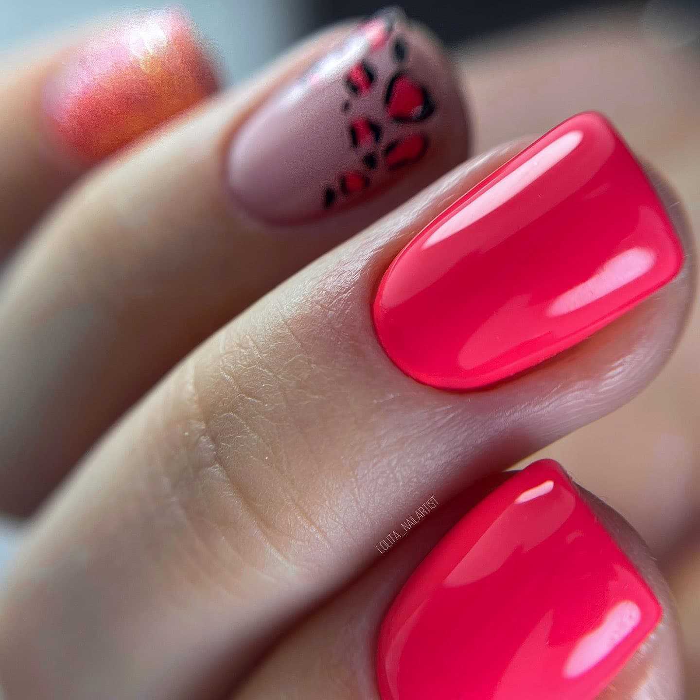 Вариант сложный, подойдет не каждой даме, поскольку цвета плохо гармонируют между собой. Для создания красивого дизайна применяют связывающие элементы в виде дополнительных оттенков: нежно-зелёного, чёрного, белого, серого. В качестве украшения красно-розового покрытия акцентируют безымянный палец объёмным рисунком.