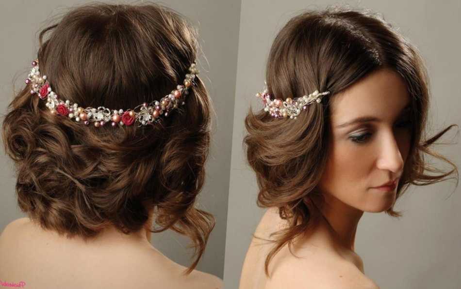 Прическа с повязкой из бисера, обрамляющей локоны на средние волосы